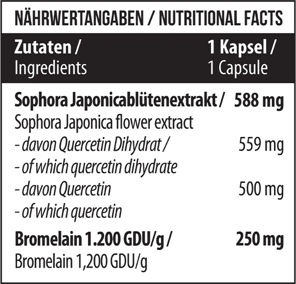 Hinweis: Für Quercetin/Bromelain bestehen keine NRV (Nutrient Reference Values). Wirkstoffmengen pro Kapsel