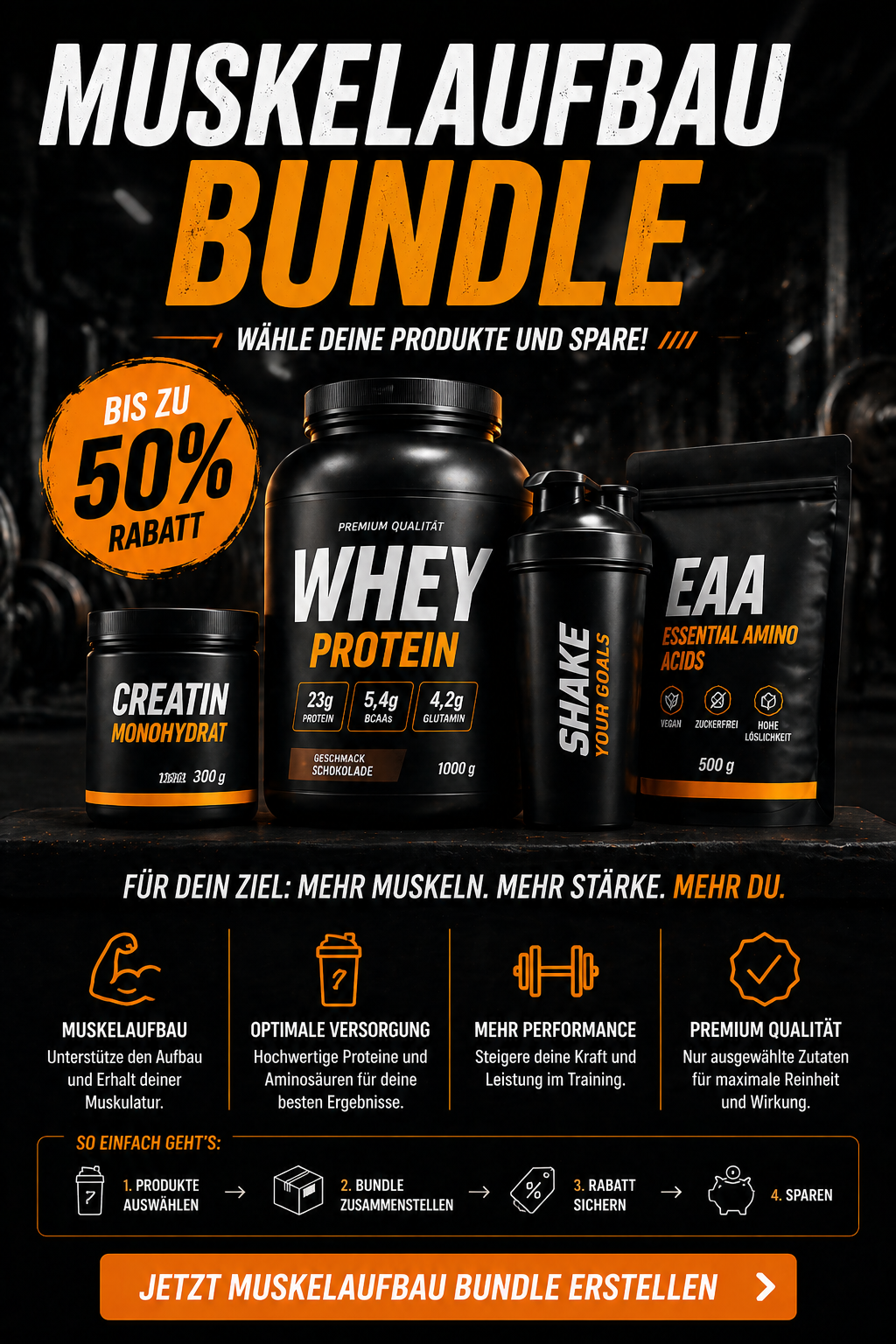 Stelle dir dein eigenes Muskelaufbau Bundle zusammen und spare dabei! Dieses Bundle wurde speziell für alle entwickelt, die ihr Training auf das nächste Level bringen möchten. Wähle bis zu 4 Produkte aus und kombiniere hochwertige Supplements ganz nach deinen Bedürfnissen.