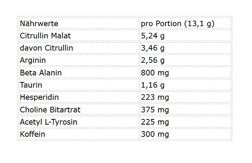 Citrullin-Malat, Arginin HCL, Beta-Alanin, Taurin, Cholin-Bitartrat, Citrus-Aurantium-Extrakt (60 % Hesperidin), Acetyl-L-Tyrosin, Aroma, Koffein, Süßungsmittel (Sucralose), Trennmittel (Siliciumdioxid).